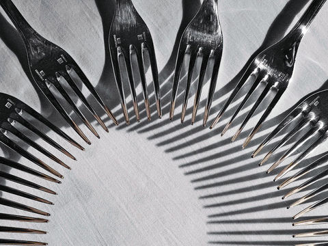 The territory is the home and intimacy, where two essential tools in the western world, a knife and a fork, are found. There, the shadows of the subject start to multiply and transmute.